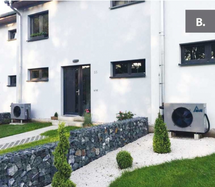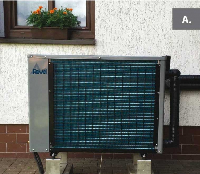 B. Výparníkem ke stěně (čelní pohled B) - doporučená vzdálenost 250mm od překážky